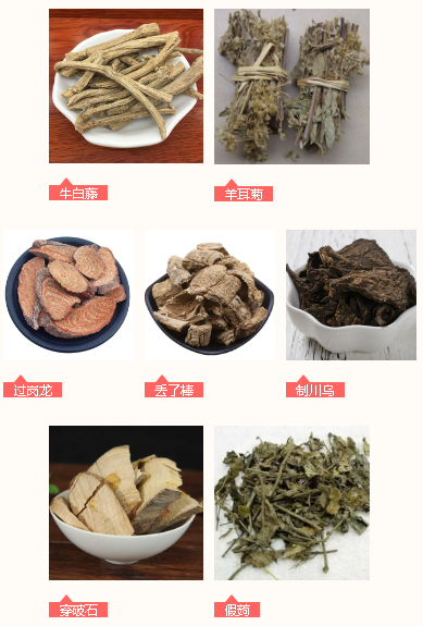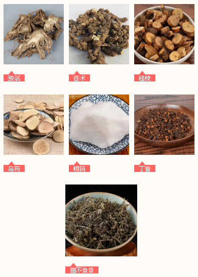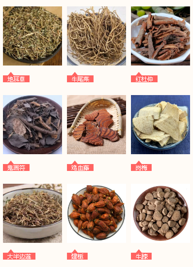佐使藥:地耳草、牛尾菜、紅杜仲、鬼畫符、雞血藤、崗梅、大半邊蓮、建梔、牛膝、獨(dú)活、蒼術(shù)、桂枝、烏藥、樟腦、丁香、鵝不食草。