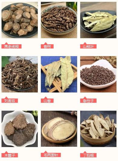 君藥:黑老虎根、香附、山桔葉、劉寄奴、山香、毛兩面針、急性子、木鱉子、丁茄根