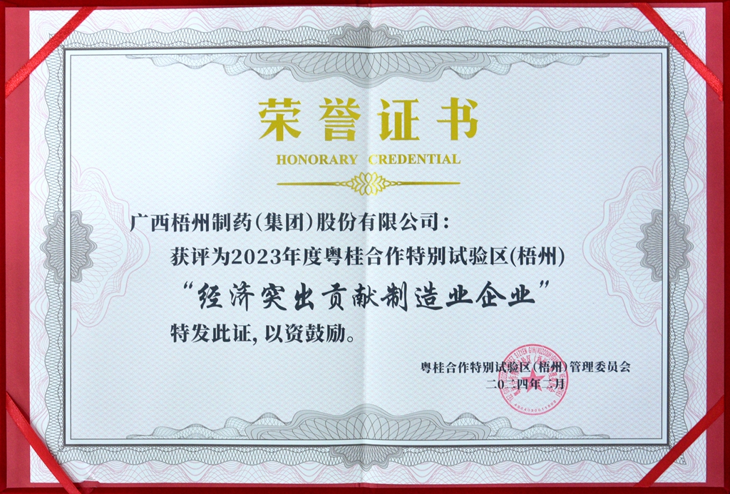梧州制藥獲評為2023年度粵桂合作特別試驗區(qū)(梧州)經(jīng)濟突出貢獻制造業(yè)企業(yè)